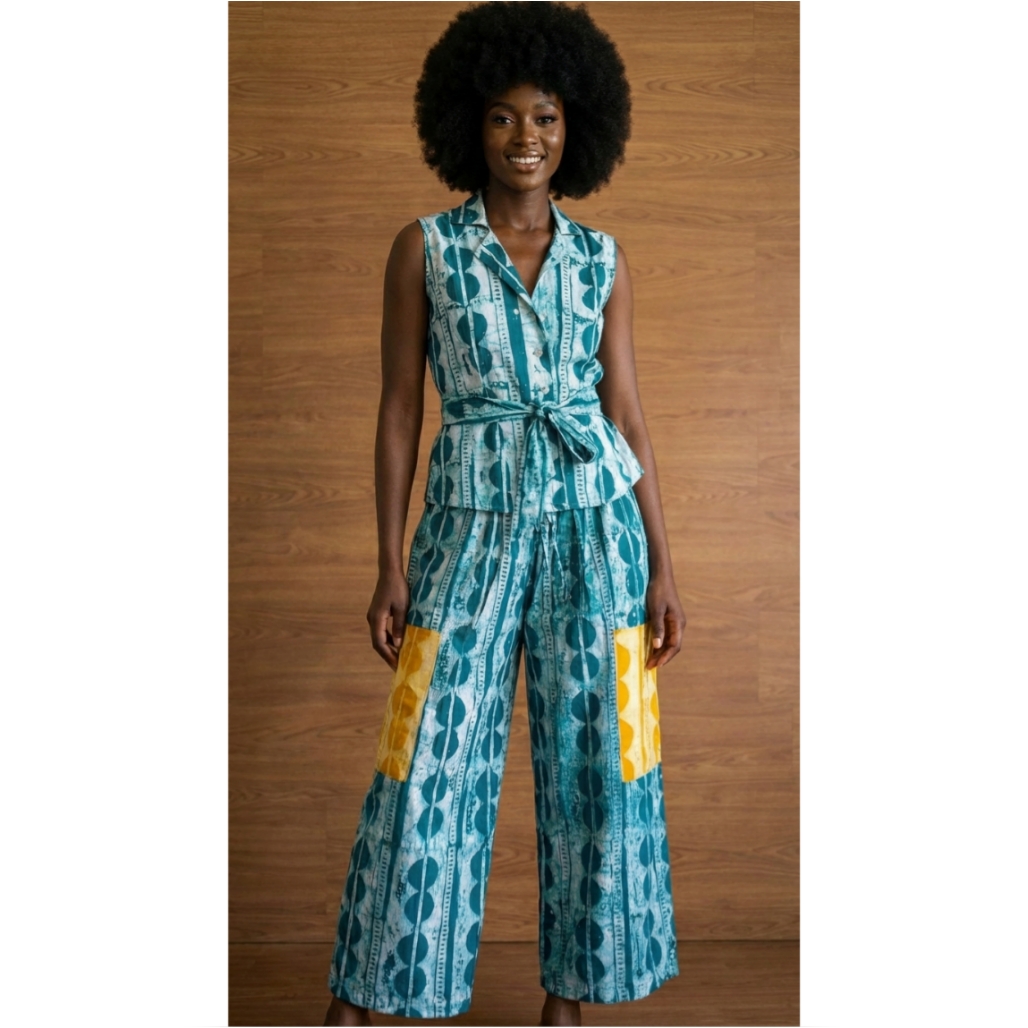 Art doesn’t hang, you wear. Kaima is the piece where culture meets self-expression, with its rich patterns and fluid silhouette. Step into your day with a look that feels as good as it looks. The Kaima piece set is thoughtfully designed for the woman who appreciates both comfort and presence. The structured peplum top cinches softly at the waist with a tie fastening, creating a flattering shape, while the wide-leg trousers give you room to move freely and confidently. Every detail speaks to a balance between heritage and modern ease, making it perfect for brunches, casual meetings, or simply owning your space wherever you go.