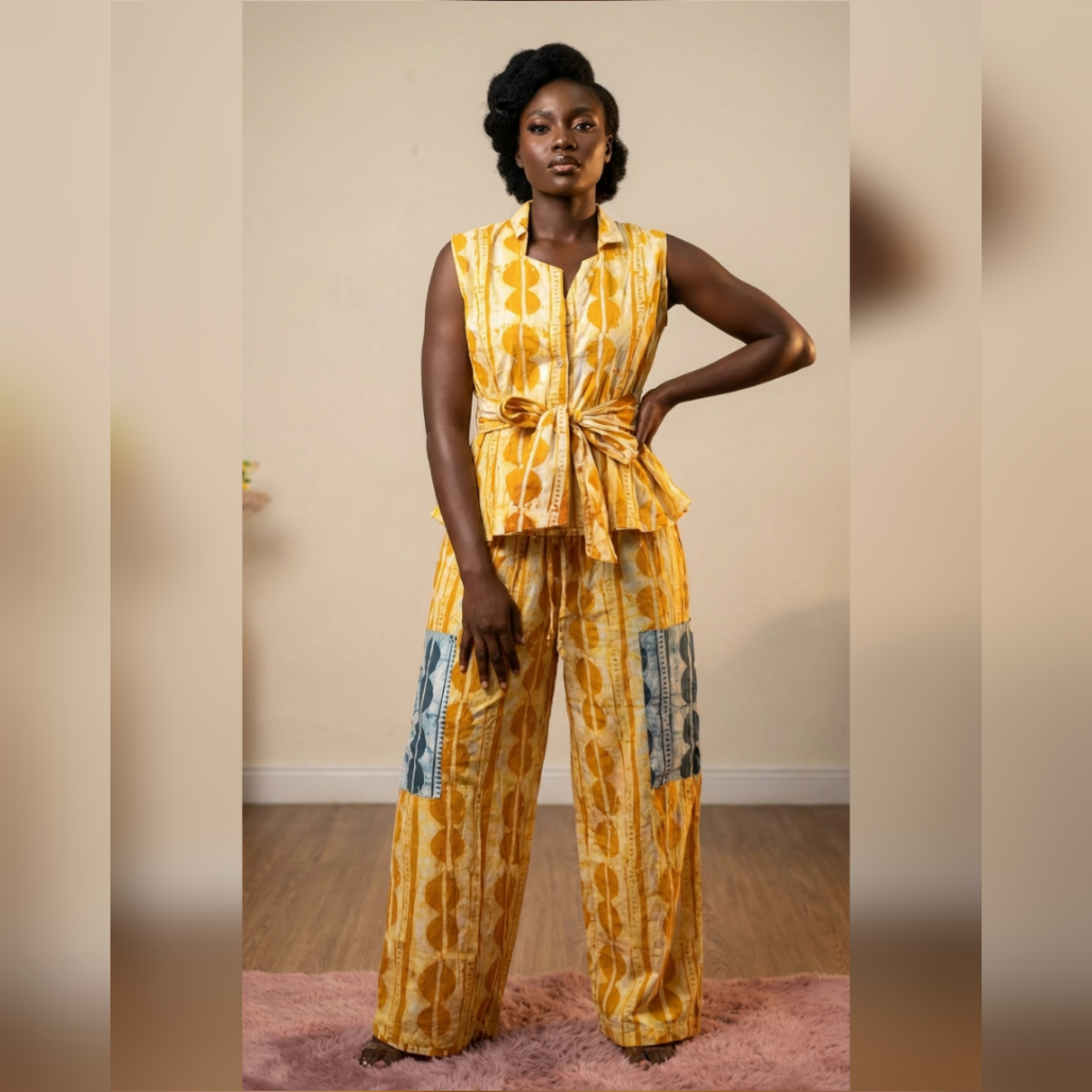 Our Boma set is designed to feel as beautiful as it looks. Inspired by the warmth and richness of a summer sunset, this co-ord set brings together comfort and bold design. The cropped top features an elasticated hem that sits just right, while the relaxed-fit trousers offer ease and movement throughout your day. The vibrant, Adire-inspired print adds character and depth, making it a standout piece that still feels effortless. Perfect for warm days, relaxed outings, or whenever you want to feel both comfortable and striking.